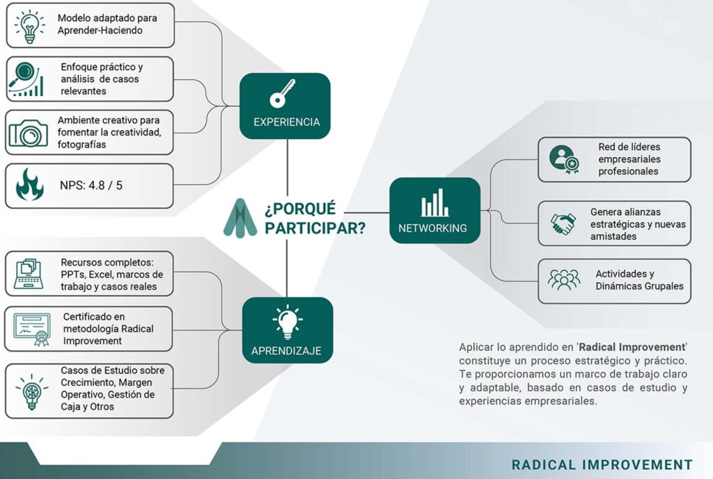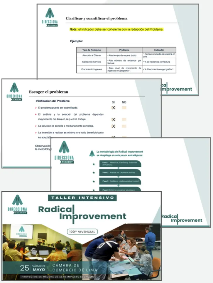 Radical Improvement es un poderoso entrenamiento vivencial de 5 horas que transformará tu capacidad analítica para resolver problemas en tu empresa y fortalecerá tus competencias clave. Este taller está diseñado para marcar la diferencia en Comités Gerenciales, mejorando tu comunicación y visibilidad, y así acelerar significativamente tu desarrollo profesional y personal.